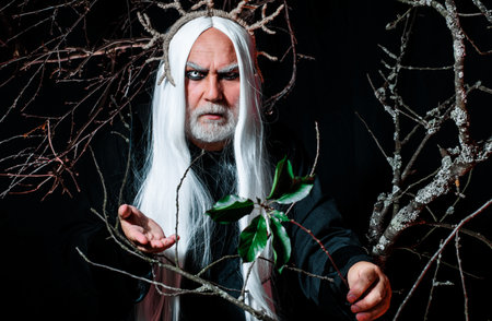Devil man on Halloween night. Bearded male in witcher costume. Sinister sorcerer vampire. Horror