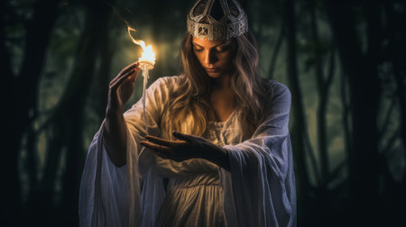 dark terrible witch with candles in her hands performs an occult mystical ritual