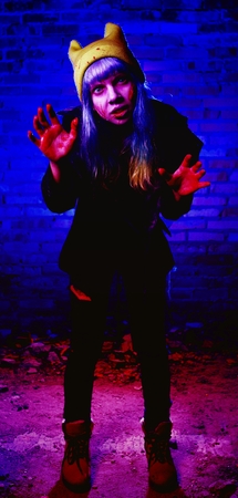 Happy Halloween! Young woman in black witch costume on party in color lighting.