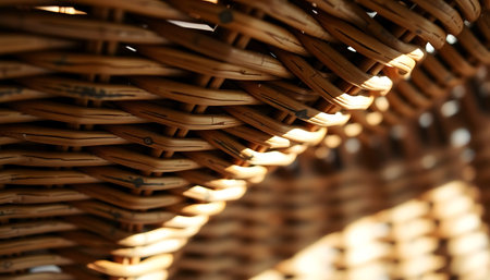 Golden sunlight catches the intricate details of a handwoven basket, highlighting the rustic texture and traditional craftsmanship.
