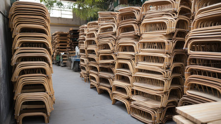 A vast storage area filled with neatly stacked wooden chairs showcases craftsmanship and design. Natural lighting highlights the textures in a clean, organized space.