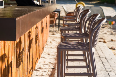 Outdoor beach bar with empty plastic chairs lined up in the sand under the sunlight, creating a relaxing tropical atmosphere