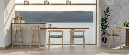Interior design of Kitchen in Coastal style with Ocean View decorated with Glass, Marble, Wood, Wicker material. Open concept architecture. Generative AI AIG24.