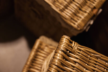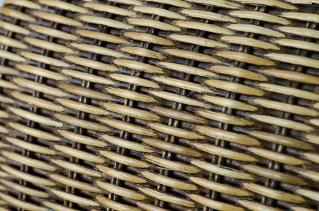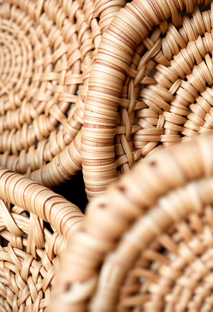 Lots of brown woven baskets made from natural rattan. Stacks of natural rattan baskets are displayed, Handmade Thai handicrafts. Selective Focus.
