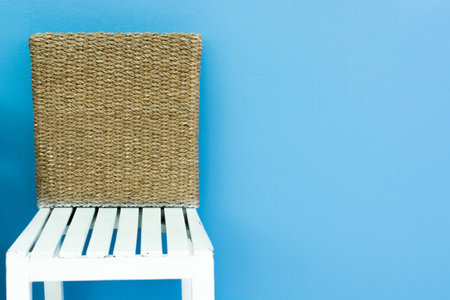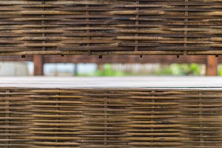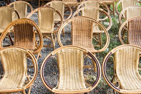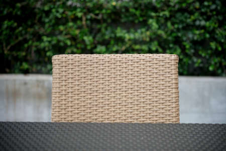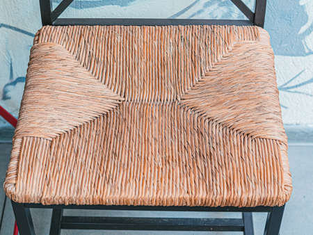 Square seat of a wicker chair with a geometric pattern. Furniture in a cafe. Beige color