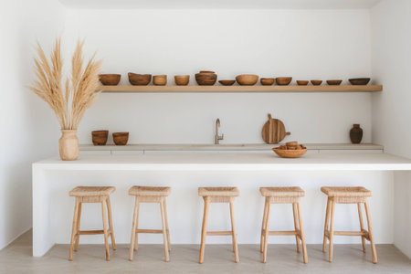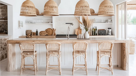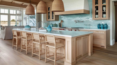 Coastal-themed kitchen interior with light wood bar stools, natural textures, and soft lighting, creating a tranquil seaside-inspired space.