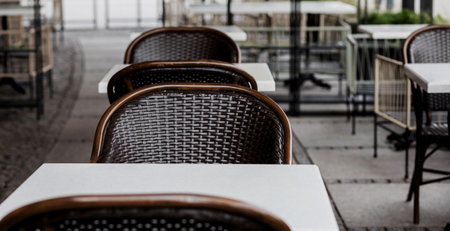 Typical street restaurant. European street terrace. Empty Cafe tables and chairs