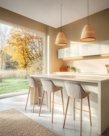 Bright kitchen features a sleek bar woven stools and a large window showcasing vibrant autumn foliage outside. Warm tones and minimalist decor create a cozy atmosphere.