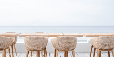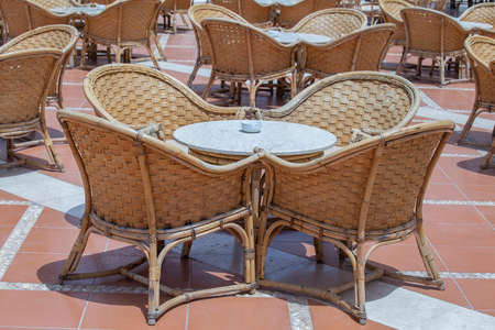 Rattan table and chairs in beach cafe next to the red sea in Sharm el Sheikh, Egypt, close up