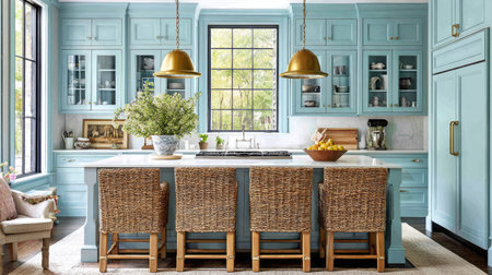 This image showcases a well-designed kitchen with teal cabinetry and a central island. Wicker bar stools are arranged in front, complementing the decor. The scene is illuminated by natural light and features brass pendant lights. Suitable for home decor projects, lifestyle publications, and related commercial use.