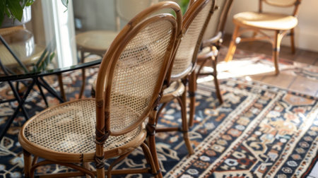 A vintage chic dining room boasting a mix of modern and antique elements such as a sleek glass dining table paired with vintage rattan chairs and a retro patterned rug