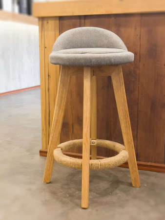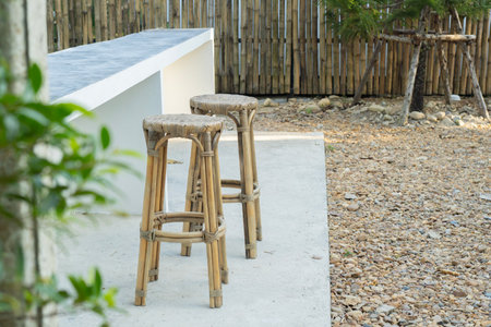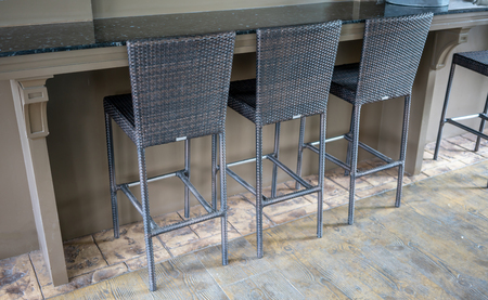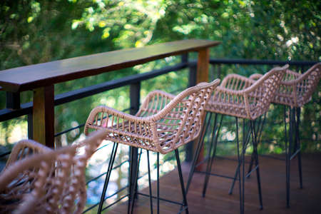 Empty tall rattan chairs placed at the bar counter or cement table at outdoor of country nature resort. Selective focus.