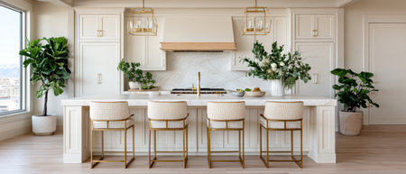 Modern kitchen with white cabinetry and marble countertop, gold fixtures, and comfortable bar stools, bright natural light and green plants create