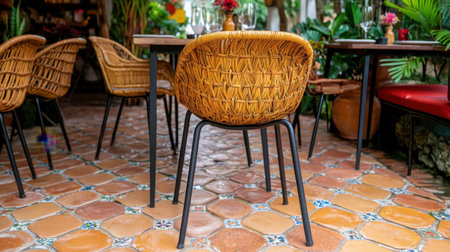 A charming rattan chair positioned in a vibrant restaurant setting. The warm tones of the terracotta floor and lush greenery create a cozy and inviting atmosphere, perfect for enjoying a meal.