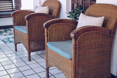 old vintage retro wicker rattan armchair chair on terrace balcony. living room interior