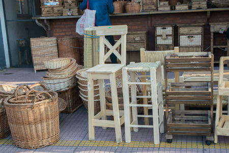 BUENOS AIRES, ARGENTINA - AUGUST 07, 2017: Wooden furniture for sale are seen at Puerto de Frutos in Tigre City, Buenos Aires, Argentina
