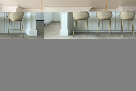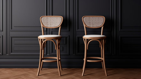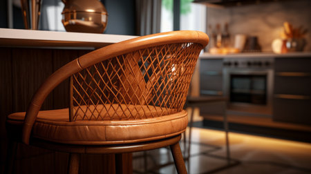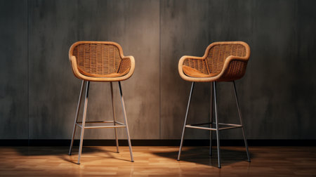 two rattan bar stools with metal legs are showcased in this room, featuring a captivating blend of hard surface modeling techniques. created using daz3d software and inspired by the iconic style of victor hammer, these stools exude a 1970s vibe. the flowing textures and hinchel or design add a unique touch, making them a texture-based masterpiece. ai generated