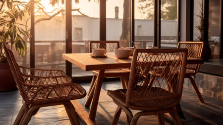 a small table and chairs are placed indoors, with the doors open to let in the sunlight. this sustainable architecture-inspired setting combines elements of dutch tradition, natural fibers, and traditional japanese artistic techniques. the warm tones and contemporary diy aesthetic create a natural and inviting atmosphere. ai generated