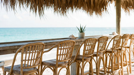 Empty tropical beach bar with wicker stools facing turquoise ocean under thatched roof on a bright sunny summer day.