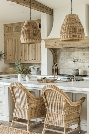 Cozy Farmhouse Kitchen with Rattan Accents and Natural Light, Interior Design Inspiration
