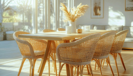 Sun is shining through the windows of a dining room with a table, rattan chairs, and pampas grass in a vase