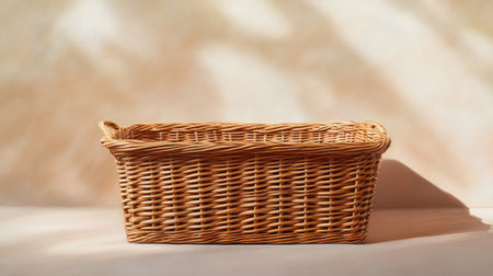 This image features a natural woven basket illuminated by soft light, set against a minimalist background, perfect for lifestyle and home decor themes.