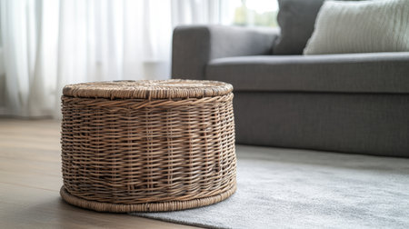 Close-up of a coffee table with a wicker basket and a grey sofa in a living room. Close-up photo of a round wooden coffee table near a gray fabric couch against a white curtain background. --chaos 30 --ar 16:9 --v 6.1 Job ID: a3a265aa-0466-425a-a13d-a6652ca906ce