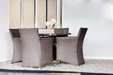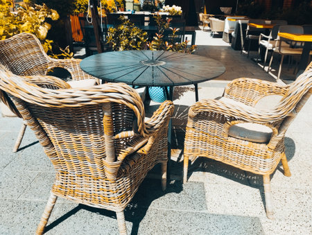 Wicker chairs and round table with flowers on the terrace near the street cafe.