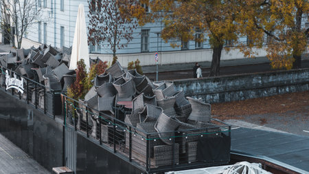 Detail of metal terrace chairs stacked and ordered