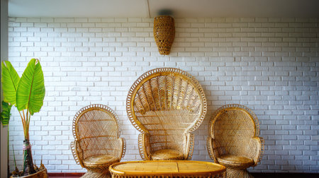 Rattan chairs and wood table on brick patio