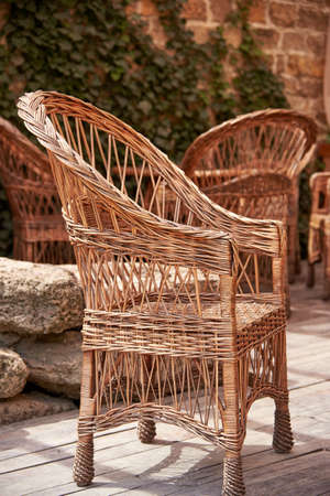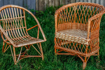 Wicker chairs for garden and backyard. Goods for relaxation and rest in the yard. Background