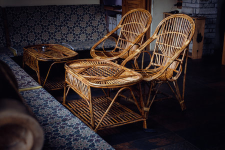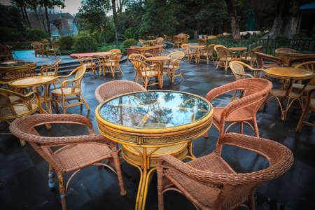 Rattan garden furniture on the terrace of a cafe. Outdoor furniture made of natural materials. Empty sits in the cafeteria in day.