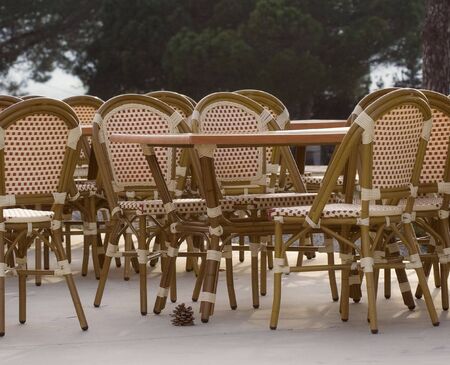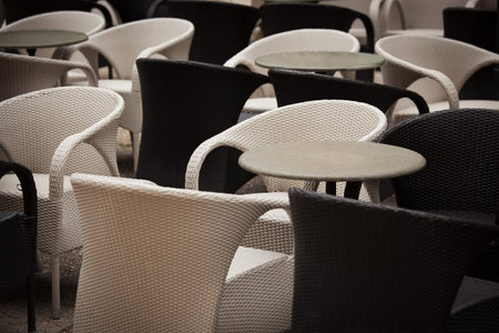 Empty chairs and tables in street cafe in the morning.