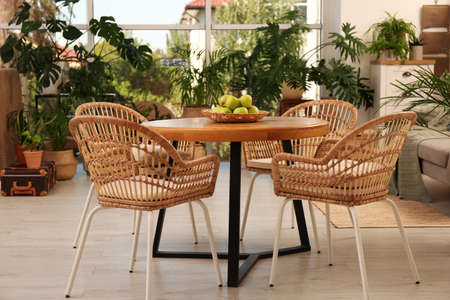 Wooden table with chairs and decor in stylish dining room, space for text. Interior design