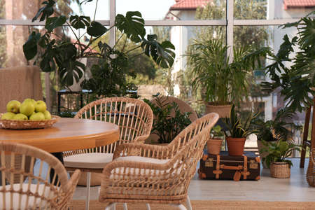 Stylish living room with beautiful plants. Interior design