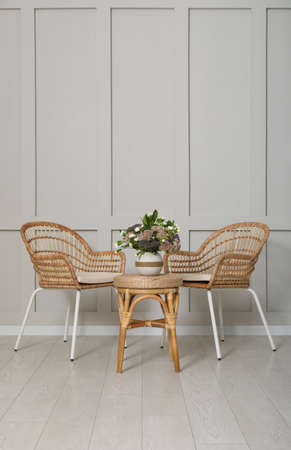 Simple room interior with set of wicker furniture, beautiful flowers and empty wall. Space for design