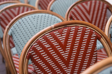 Closeup of green and red wooden chairs at the retro terrasse of restaurant in the street