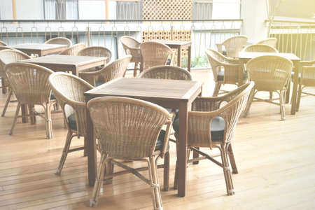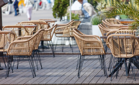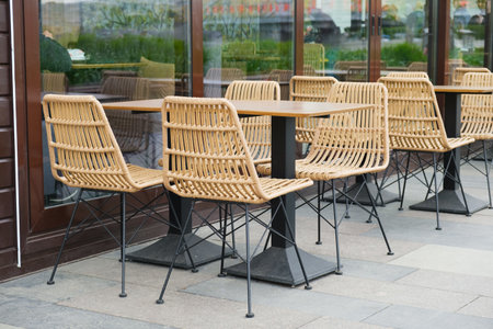 Empty tables and plastic wicker chairs on the summer terrace near a small cafe. The restaurant is open and waiting for guests. Cafeteria furniture outside.