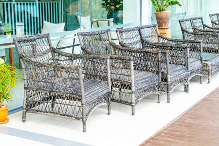 Rattan garden furniture on the terrace of a restaurant or hotel cafe. Outdoor furniture made of natural materials. Empty sits in the cafeteria in day.