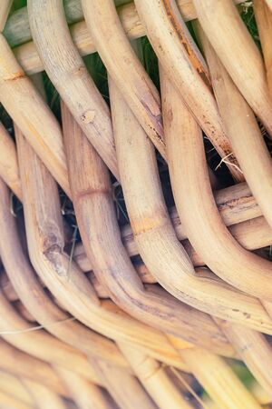 Wicker basket. Wooden basket. Rattan basket. Detail of a rattan basket. Wicker surface. Harvest and countryside background.