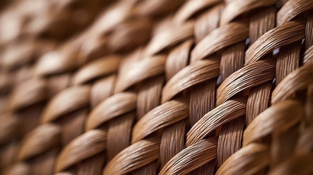 Detailed macro shot of a woven brown rattan texture forming a circular pattern Clear details and vibrant color...