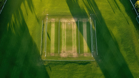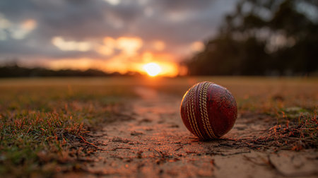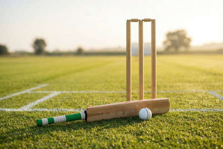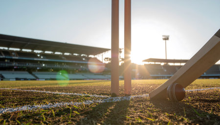 Close up of cricket equipment on a grassy pitch with white lines, illuminated by the golden hour sun against a stadium backdrop Evokes the atmosphere of the game