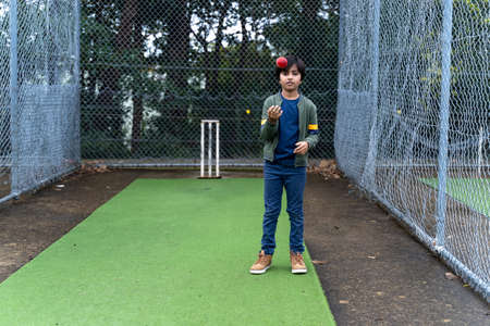 Young boy playing with red cricket ball. Kid bouncing ball. Cricket playing child concept.