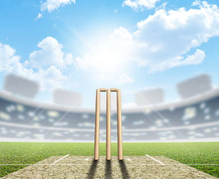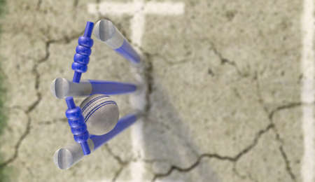 A white leather cricket ball hitting blue cricket wickets on a cracked grass pitch background - 3D render