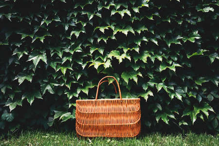 Rattan eco basket for food or lunch in the garden among plants. Eco-friendly concept of consumption and shopping.