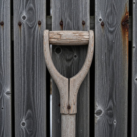 Close-up, square format photograph capturing the textural collision between a worn wooden snow shove