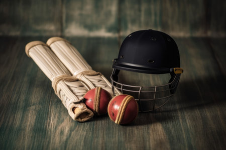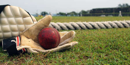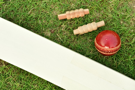 Cricket sport equipments, leather ball, bat, helmet, grass court and sand court, soft and selective focus.