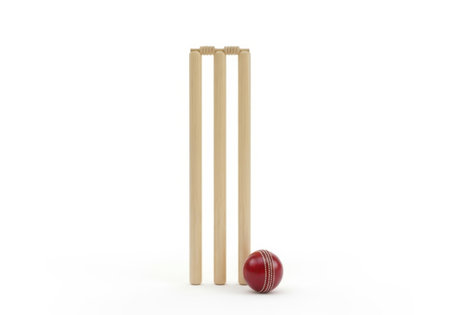 A red cricket ball striking wooden cricket wickets with dislodging bails on a day sky background - 3D render