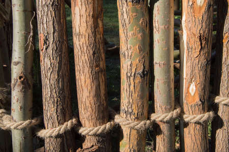 Rope tied in a knot around wooden poles, fence posts. Closeup
