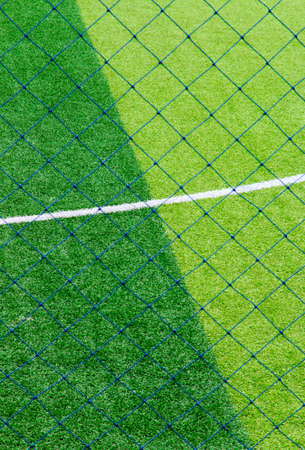 Close-up of a tennis net on a court with sunlight in the background, low angle view. Sport and summer concept